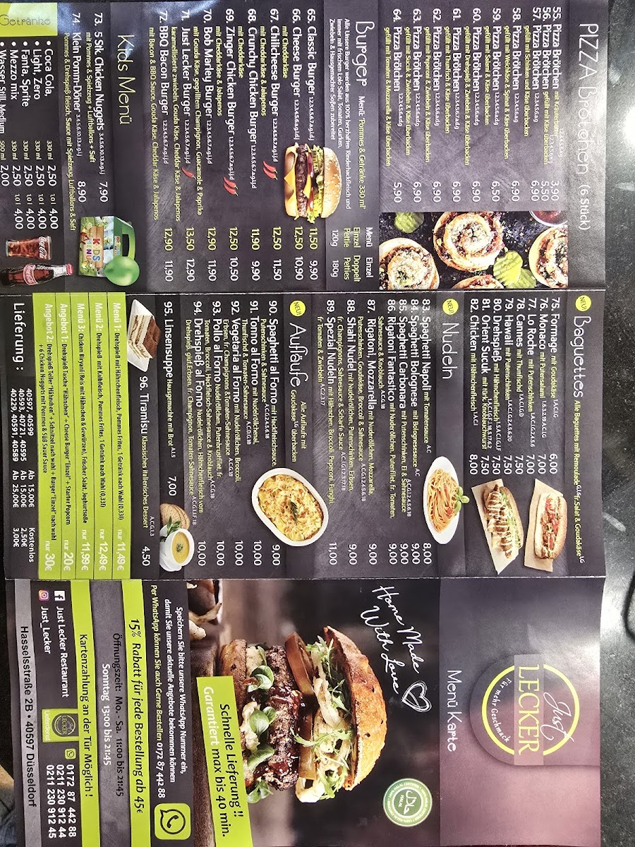 Welcome to Just Lecker, a vibrant fast-food restaurant located at Hasselsstraße 2b in Düsseldorf. This delightful eatery specializes in Turkish and international fast food with a focus on fresh ingredients and bold flavors. The menu shines with a variety of Pizza Brötchen, each generously filled, from the classic cheese option to those featuring savory combinations like spinach, cheese, and salami—perfect for a quick bite.